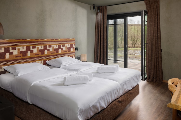 Deze ruime hotelkamer is geschikt voor 4 personen. De kamer is ingericht met 1 tweepersoonsbed. Via de trap bereik je de open slaapvide met 1 tweepersoonsbed. Er is een minibar, een waterkoker en een koffiecupapparaat. Zo start je de dag op een ontspannen manier met een kopje koffie of thee. Ook is er een televisie, gratis wifi en airconditioning aanwezig. De badkamer is ingericht met een inloopdouche. Er is een apart toilet. De hotelkamer heeft een terras met uitzicht over de heuvels. Op de...